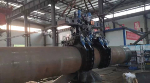 而为了高效完成卸管和对口作业,德平团队根据对口的作业流程,研发了一套柔性抓具。相较于普通刚性抓具,该抓具不仅能够保持钢管稳定,还可以根据母管和子管的相对位置,通过液压系统对子管进行角度调整甚至转动,配合具备大角度爬坡能力、能够通过5D弯管的新型液压内对口器,一举将山地大口径钢管的对口时间缩短至30分钟以内,从而极大地保证了作业的安全性,确保自动焊系统发挥最大生产效能。